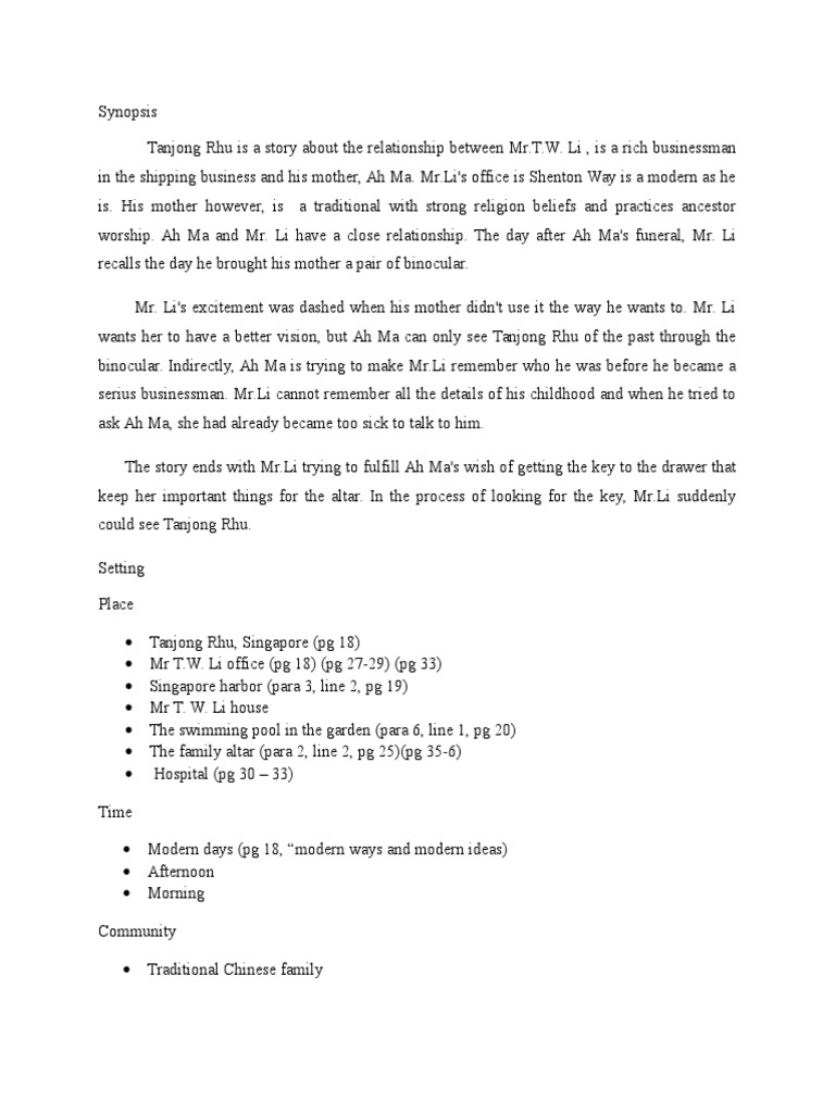 Download View Form 4 Short Story Tanjong Rhu Sample Answer as PDF for free. LITERATURE FORM 4 SHORT STORY TANJONG RHU BY MINFONG HO A story from Singapore retold by Clare West Prepared by Teacher Nor Yusrina binti Ahmad. Tanjong Rhu by Minfong Ho Form 4 DRAFT.